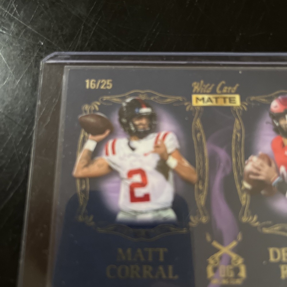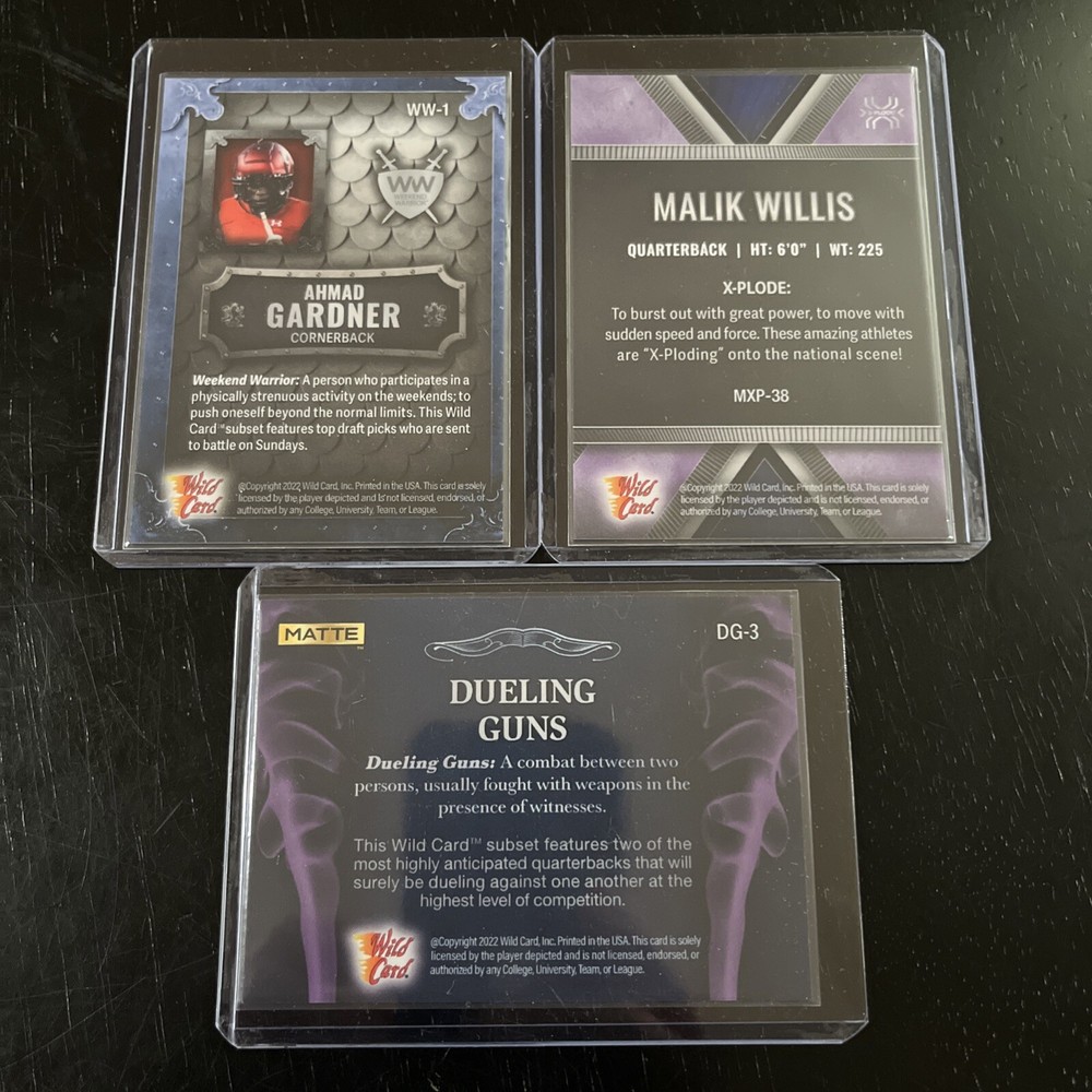 Elevate your sports card collection with the 2022 Wild Card Qty 3 Lot, featuring promising talent in Malik Willis, Matt Corral, Ahmad Gardner, and Desmond Ridder. Each card is a testament to the players' potential, captured in a standard-sized, high-quality card stock format. Manufactured in the United States, these cards are from the original batch, ensuring authenticity and value. The lot includes three cards, each serial numbered – Malik Willis /100, Ahmad Gardner /75, and Matt Corral & Desmond Ridder /25 – marking them as distinctive pieces for collectors and fans alike. The 2022 season is encapsulated in this collection, offering a snapshot of these athletes' early careers. Whether for display or trade, these cards are a noteworthy find for any enthusiast.