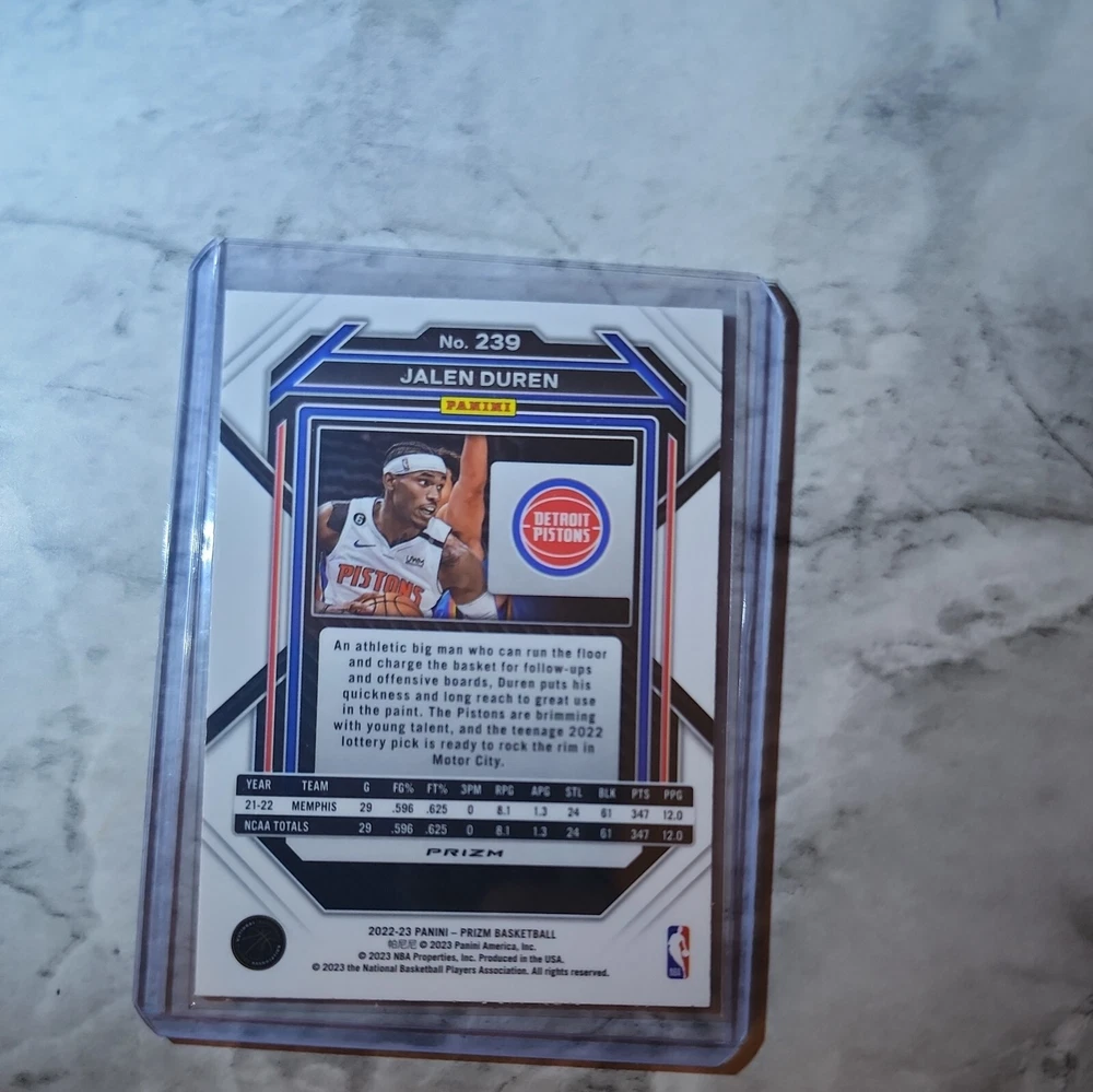 This 2022-23 Panini Prizm trading card features Jalen Duren, a rising star in the National Basketball Association (NBA). The card is part of the base set and includes a silver prizm parallel/variety. It is a rookie card, perfect for collectors who want to add to their collection. The card is ungraded and is near mint or better. It is a great addition to any sports trading card collection and is sure to impress. Don't miss out on the opportunity to own this amazing card.