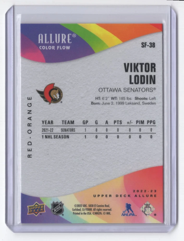 About Me Other Listings Feedback Add to Favorites Contact Me Striking Cards 901 2022-23 Red-Orange Viktor Lodin Rookie Ottawa Senators #SF-38 No stock photo / These are real scans or pictures Details Description: Viktor Lodin Category: Hockey Year: 2022 Product: Upper Deck Allure Color Flow Set: Red-Orange Team: Ottawa Senators Card Number: SF-38 Rookie: Yes Dimensions: 4" x 3" SKU: HK B0001 R01 C (9) Listing By Kronocard trading cards software v2.6.5.3