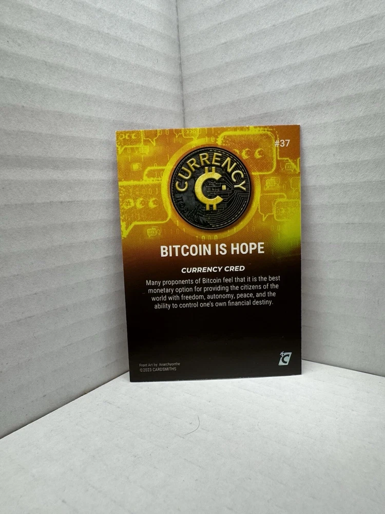 The 2023 Cardsmiths Currency Series 2 Base Bitcoin Is Hope #37 is a non-sport trading card made of card stock material. It features the character Bitcoin Is Hope and is part of the 2023 Cardsmiths Currency Series 2 set. The card is an original and not a reprint, and it is not autographed. The card is a standard size and was manufactured in the United States in 2023. It is suitable for ages 4 and up. The card has various features such as being a 1st edition, collector's edition, limited edition, and short print. It is also an insert and chase card. The card is associated with various genres such as action, war, TV & movies, history, western, glamour, video games, comedy, mystery, spy, teen, military, sports, adventure, horror, romance, superhero, sci-fi, parody, music, crime, fantasy, satire, political, comics, and supernatural. The card is in English language and has a card number of 37.