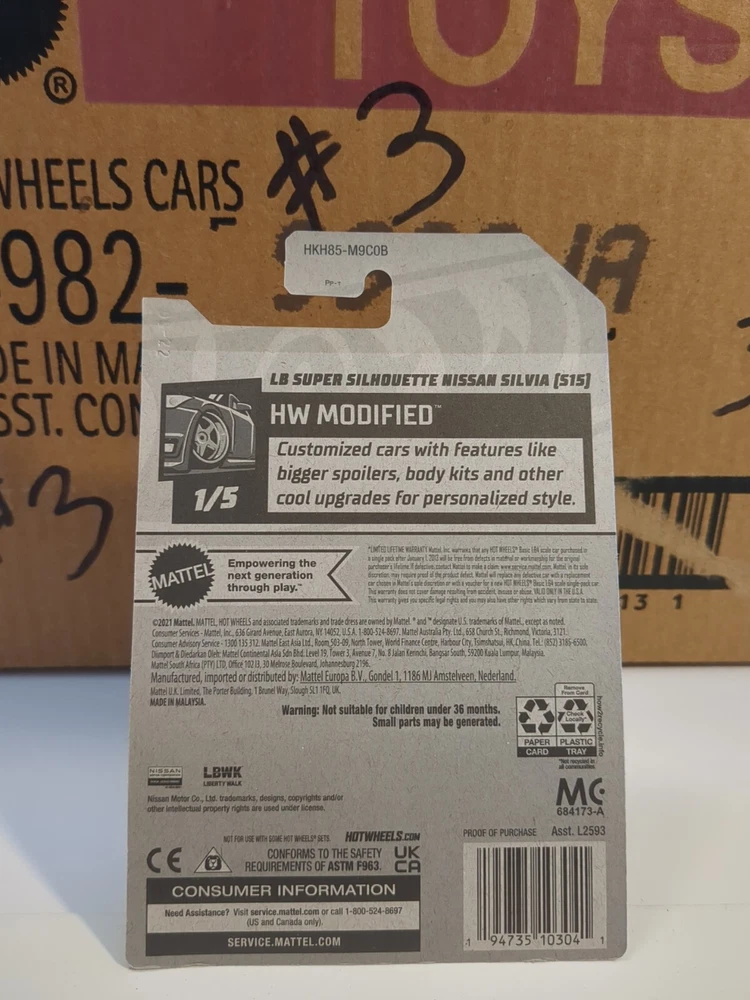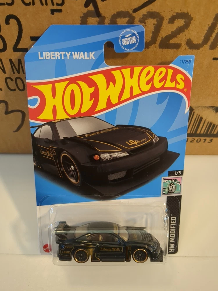 For all the diecast car collectors out there, check out this amazing Hot Wheels car from the HW modified series. This 1:64 scale Nissan Silvia (S15) Liberty Walk car is a must-have for any fan of the brand. The black color and intricate design make it a great addition to any collection. This unopened box car from 2022 is made of high-quality diecast material and features a lot of cool aspects, including the brand name Hot Wheels. Whether you're a car enthusiast or just looking for a great toy to play with, this Nissan Silvia car is sure to impress. Add it to your collection today! See pics for condition