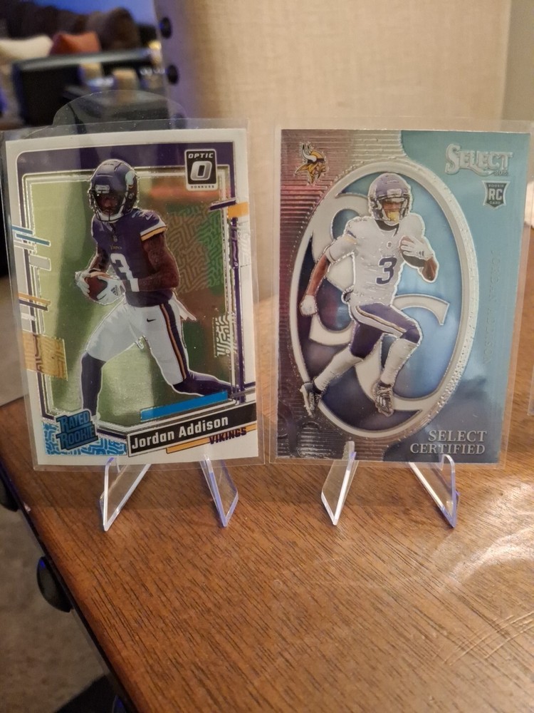 The product is a 2023 Jordan Addison rookie trading card lot featuring a total of 4 cards. Manufactured by Panini for the 2024 season, the set includes cards from the 2023 Donruss Optic and 2023 Select collections. The cards feature Jordan Addison, a player for the Minnesota Vikings in the National Football League (NFL). The lot includes base set, rookie, and insert cards at different levels such as Select Certified, Base, Field Level, and Donruss Optic. The cards are not autographed and are from the country/region of Jordan.