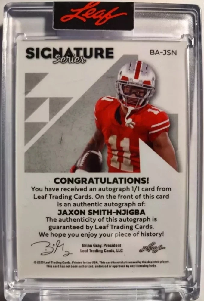 This rare and highly sought-after sports trading card is a must-have for any serious collector. Featuring an autographed XRC parallel variety of the 2023 Leaf Signature Series, this card is a one-of-a-kind limited edition rookie card. The card is stamped and serial numbered as #1/1, making it a unique and valuable addition to any collection. The card features Jaxon Smith-Njigba, a talented player from the Seattle Seahawks team in the National Football League (NFL). It is a short print, making it even more valuable and sought-after by fans and collectors alike. This sports trading card is manufactured by Leaf and is part of the 2023 season set. Don't miss out on the chance to own this rare and exceptional card.
