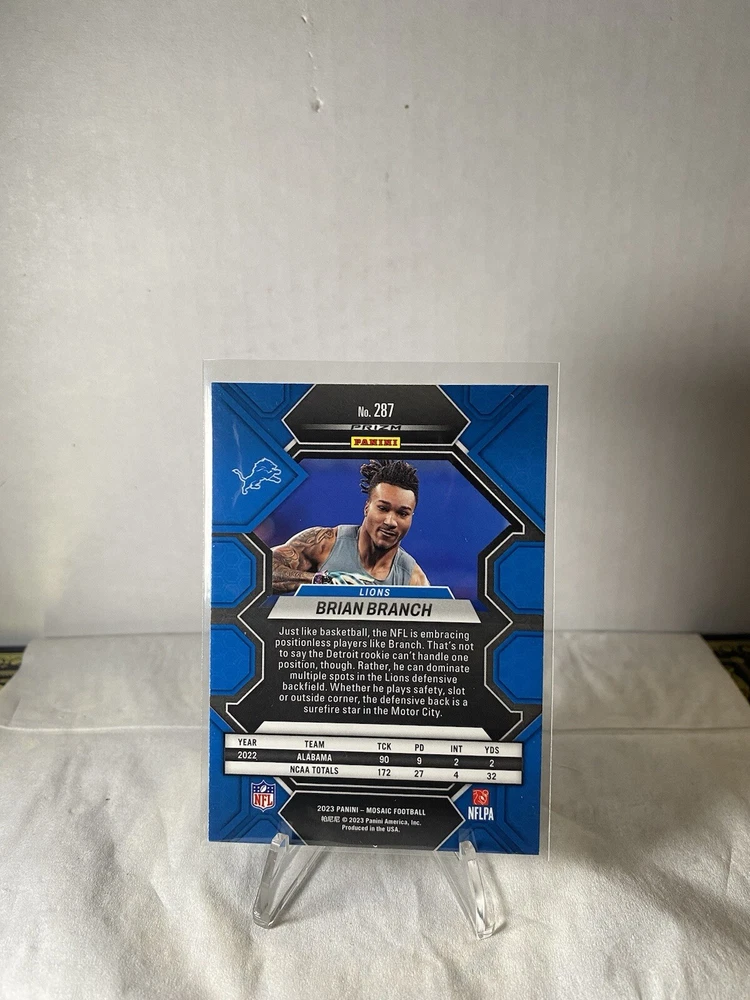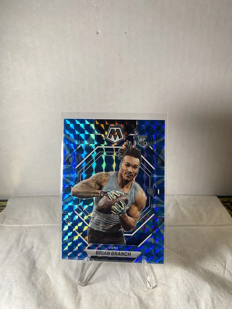 This is a 2023 MOSAIC FOOTBALL trading card featuring the rookie Brian Branch of the Lions. The card is part of the MOSAIC FOOTBALL ROOKIE REACTIVE BLUE LIONS set and has a card size of 3½" x 2½". It is an original card and has not been autographed. The card number is unspecified and it is a parallel variety of the Reactive Blue series. The features of the card include being a rookie card and belonging to the Football franchise. The game is unspecified and it is a great addition to any sports trading card collection.