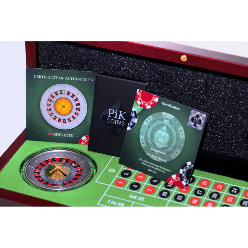 FREE SHIPPING ON DOMESTIC ORDERS New releases Deals Exclusives Bullion Gold Graded Licensed Standing behind our products & our name for over a century SINCE 1915 SHOP BY CATEGORY Animal Theme Art Coins Coin Sets Comics, Notes, & Foils Deals Famous Figures & Landmarks Gold Coins GR Reserve Exclusives Graded Coins Holiday Theme Licensed Products Lunar Calendar Nature Coins Premium Bullion Rare Certificate Numbers Shaped Coins Warriors & Gods Other PARTNERS & AFFILIATIONS STORE NEWSLETTER Add us to your Favorites and receive exclusive emails about new items and special promotions! Sign up 2023 Niue Roulette 3 oz Silver Ultra High Relief Gilded Antiqued Coin Product Description We are proud to present you a unique silver coin with a roulette theme. The coin’s centerpiece is a detailed reproduction roulette, with handpainted number fields that add authenticity and artistic value. The gilded cone and dial highlight the elegance of the design, creating a harmonious color composition. The interactive 3 ounce coin comes with spinning ball. Thanks to this, as well as the included game board and a set of tokens included in the box, the coin can be used for a real roulette game. This makes it not only a unique collector’s specimen, but also a functional gaming set that can provide hours of fun. A coin with a roulette motif is an ideal choice for collectors who appreciate uniqueness, craftsmanship and additional functionality for their collections. The coin’s obverse refers in its design to a casino token. Limited mintage of 555 pieces only. Contact Shipping Payment Returns To contact our Customer Service Team, simply click the button here and our Customer Service team will be happy to assist. Domestic Shipping Options - Free shipping USPS Ground Advantage UPS Ground Saver International Shipping Options – Calculated USPS Priority Mail International UPS Worldwide Expedited UPS Worldwide Saver UPS Standard to Canada Handling time Will ship within 1 business day of receiving cleared payment. Ship From Location Attleboro, Massachusetts, 02703, United States Note to international buyers The item price and shipping charges do not include import duties, import taxes, and customs clearance fees. These charges are the buyer's responsibility. Please check with your local customs office to determine what these additional charges may be prior to bidding or purchasing an item. If your order is returned to GR Reserve due to your refusal to pay duties or taxes, or if the carrier (for example, Federal Express or UPS) was unable to deliver your order, you agree you are responsible for any return shipping fees, additional duties, or applicable taxes for returning the package back to GR Reserve. In addition, if your package is returned to GR Reserve, we will not reship your order unless and until we are paid in full for any return shipping costs, duties, taxes we have had to pay or advance for you as well as any subsequent re-ship fees back to you. Immediate payment is required upon selecting "Buy It Now" or upon checking out through the cart. We accept payment via U.S. PayPal accounts and all Major Credit Cards, Debit Cards & Google Pay. We are legally required to collect sales tax in those states and localities where we maintain a physical presence. The applicable amount of sales tax charged to an order will be calculated based on the shipment destination's state and local sales tax laws. Thank you for shopping with us on eBay! Standard Other eBay Mastercard® Earn up to 5x points when you use your eBay Mastercard®. Learn more GR Reserve’s return, refund, and exchange policy is limited to (30) business days from the date that you received your item. If you find you have received a defective item, please contact us, and include detailed photos. GR Reserve will then assess whether the product is eligible for a return, refund, or exchange. For approved exchanges, you must follow all instructions provided by us, including packaging the product appropriately. We are responsible for the cost of return domestic shipping and the risk of loss during the return shipment. Refer to eBay Return policy for more details. You are covered by the eBay Money Back Guarantee if you receive an item that is not as described in the listing. Free Shipping On all domestic order 100% SATISFACTION GUARANTEED About Feedback GR Reserve - Attleboro, MA 02703