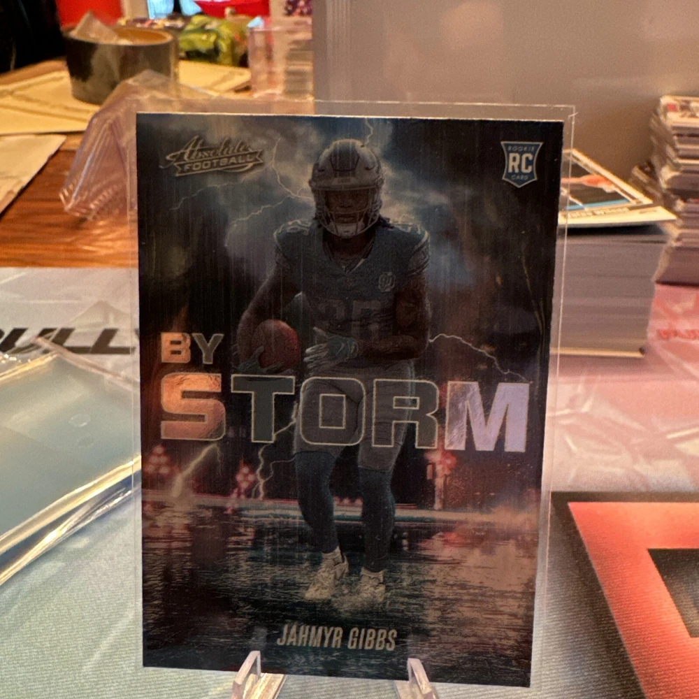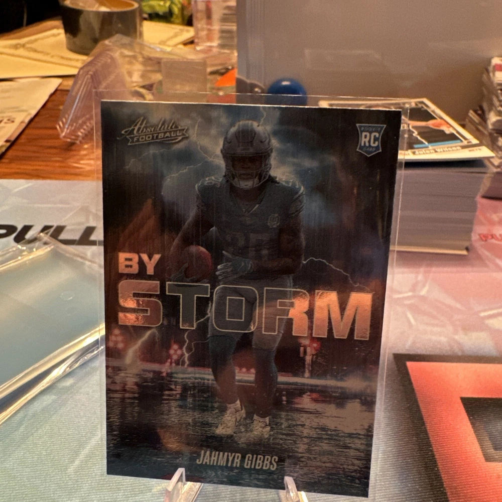 This 2023 Panini Absolute trading card features rising football star Jahmyr Gibbs, who is taking the league by storm. The card is numbered BST-8 and is a rookie insert, perfect for any fan or collector of sports trading cards. Manufactured by Panini, this card is part of their Absolute set and is a great addition to any collection. The card is not autographed but is in excellent condition. It features the Detroit Lions team and is a must-have for any fan of the National Football League (NFL). Don't miss your chance to add this 2023 Panini Absolute Jahmyr Gibbs card to your collection today.