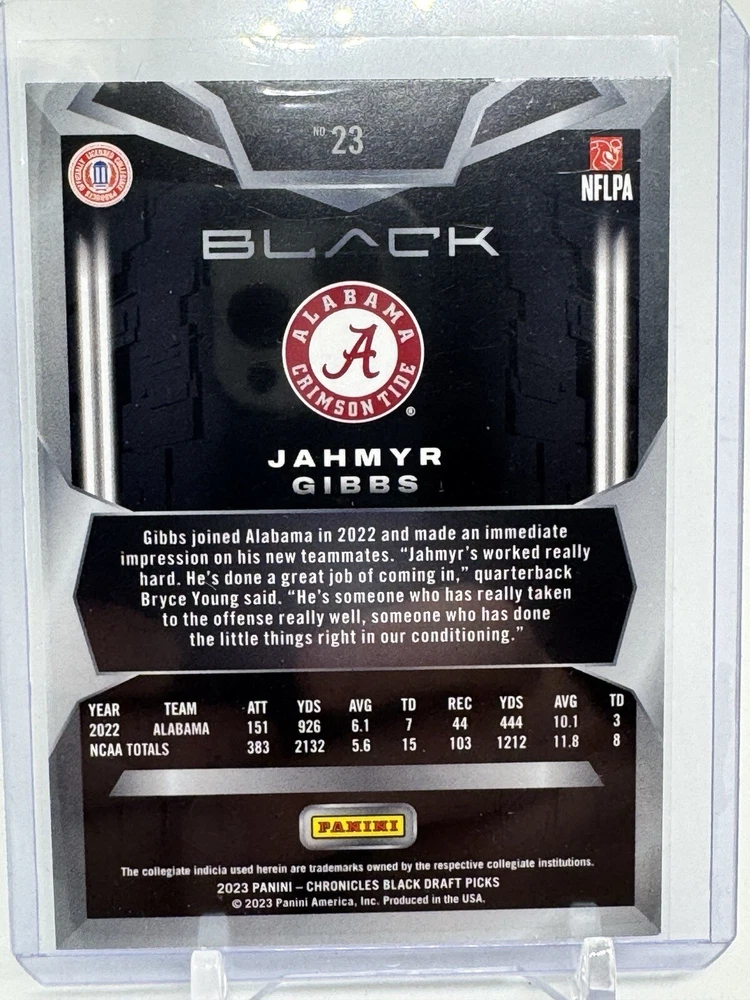 This 2023 Panini Chronicles Draft Picks card features Black Pink #23 Jahmyr Gibbs (RC), a rising star in the sports trading card world. With its sleek design and high-quality printing, this card is a must-have for any serious collector. The card is ungraded and comes from the Sports Trading Cards category, specifically the Sports Mem, Cards & Fan Shop subcategory. It is perfect for those who are looking for a rare and valuable addition to their collection. Don't miss out on the opportunity to own this stunning card.