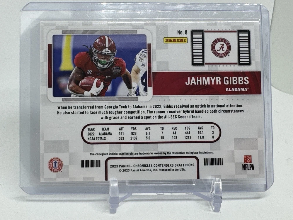 This 2023 Panini Chronicles Draft Picks - College Ticket #8 Jahmyr Gibbs (RC) is a must-have for any sports trading card enthusiast. The card features a college ticket design and showcases the talents of Jahmyr Gibbs, making it a valuable addition to any collection. With its unique design and high-quality printing, this card is sure to impress. It is perfect for those who want to add a touch of college sports history to their collection. Don't miss out on this opportunity to own a piece of sports memorabilia that is sure to impress.