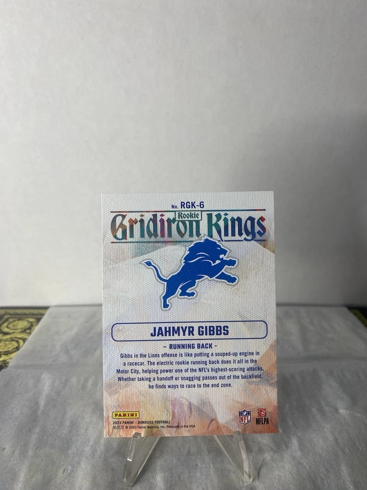 This 2023 Panini Donruss trading card features Jahmyr Gibbs, a rising star in the football world and a member of the Detroit Lions. The card is a must-have for any collector who loves sports trading cards, especially those who appreciate rookie cards and cards from the Gridiron Kings series. The card number is RGK-6 and it is a retail parallel/variety card manufactured by Donruss. The card is part of the 2023 Panini Donruss set and features Jahmyr Gibbs in his Detroit Lions uniform. The card is perfect for fans of the Lions or anyone who appreciates Gibbs' talent on the field. This trading card is a great addition to any collection and is sure to be a prized possession for years to come.