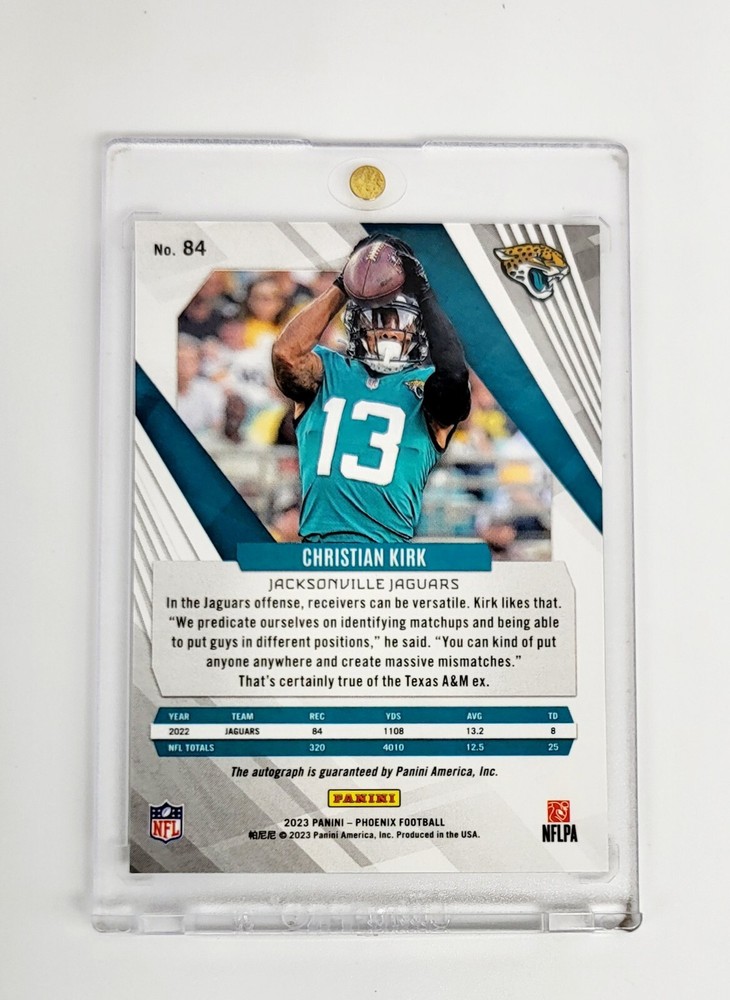 This is a rare and highly sought-after MINT SILVER AUTO Christian Kirk trading card from the 2023 Panini Phoenix set. The card features an exclusive, limited edition design and is perfect for any Jacksonville Jaguars or Christian Kirk fan. The autograph is a bonus, making this card a valuable addition to any sports trading card collection. The card is manufactured by Panini and is a short print, parallel/variety, with a card number of 84. It is a single, trading card and is part of the National Football League (NFL) league. The season is 2023 and the features include a chase for additional exclusives. Don't miss your chance to own this highly coveted card. One touch not included. Card will be well protected and shipped in toploader case.