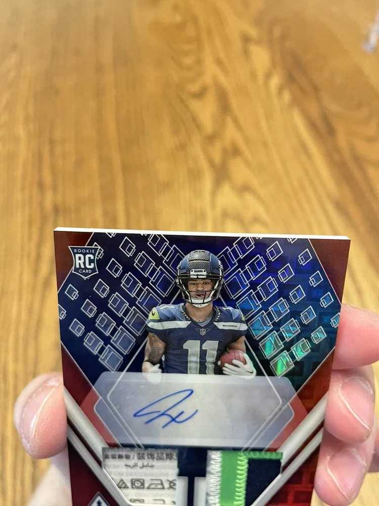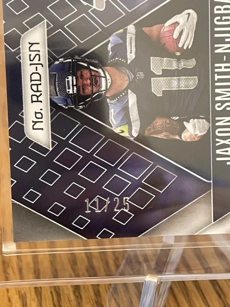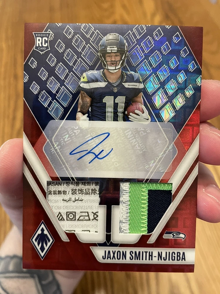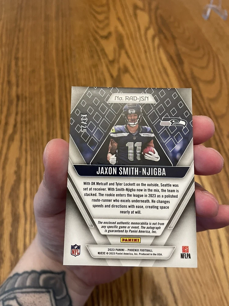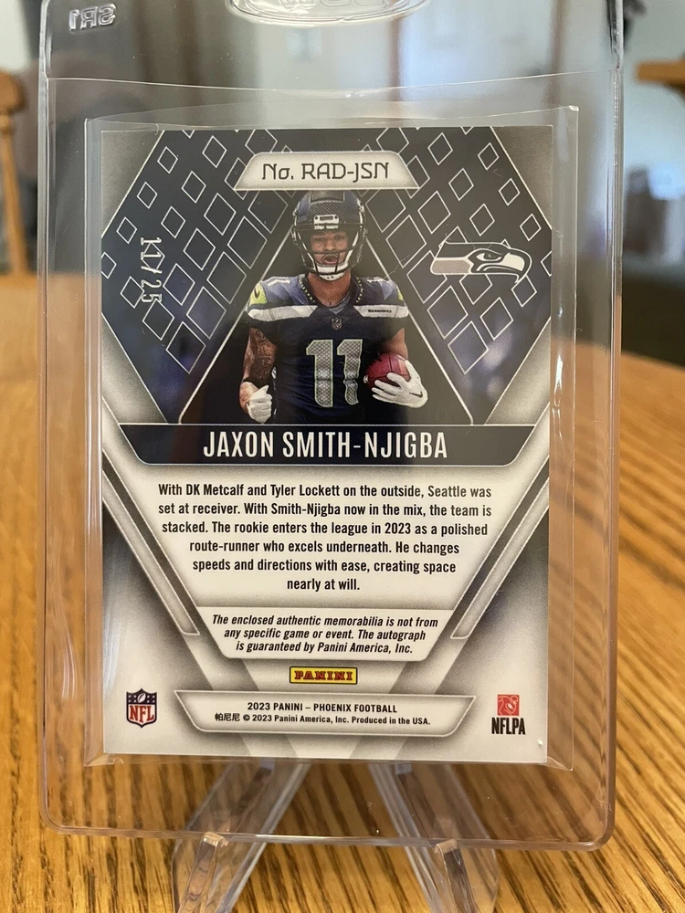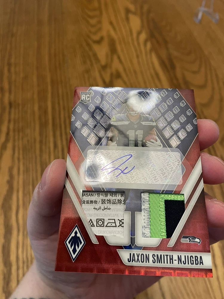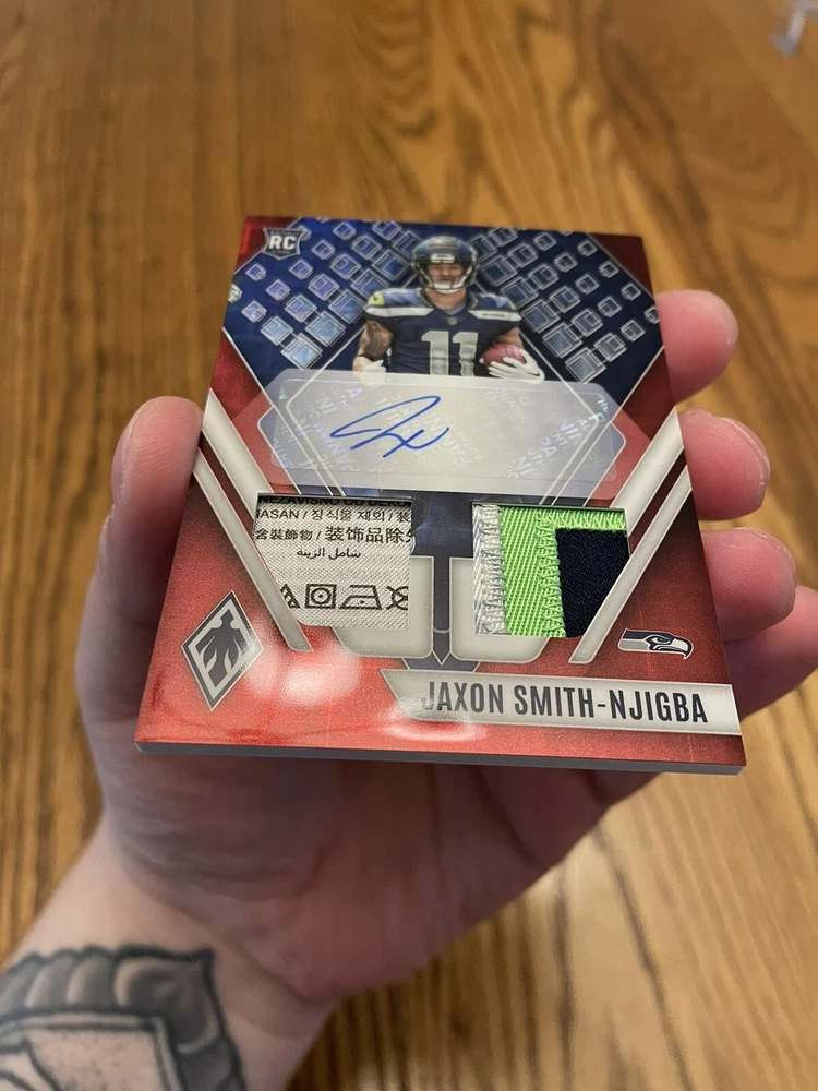 For the avid sports fans out there, this rare 2023 Panini Phoenix sports trading card is a must-have addition to your collection. Featuring Jaxon Smith-Njigba, a rookie player from the Seattle Seahawks, this card is guaranteed to impress. With an autographed premium patch and a dual laundry tag RPA red parallel variety, this card is truly a unique find. The card is limited edition, with only 25 copies produced, and is numbered RAD-JSN for easy identification. As a part of the National Football League (NFL), this card is highly sought after by collectors and enthusiasts alike. Don't miss out on the chance to own this exclusive piece of sports memorabilia.