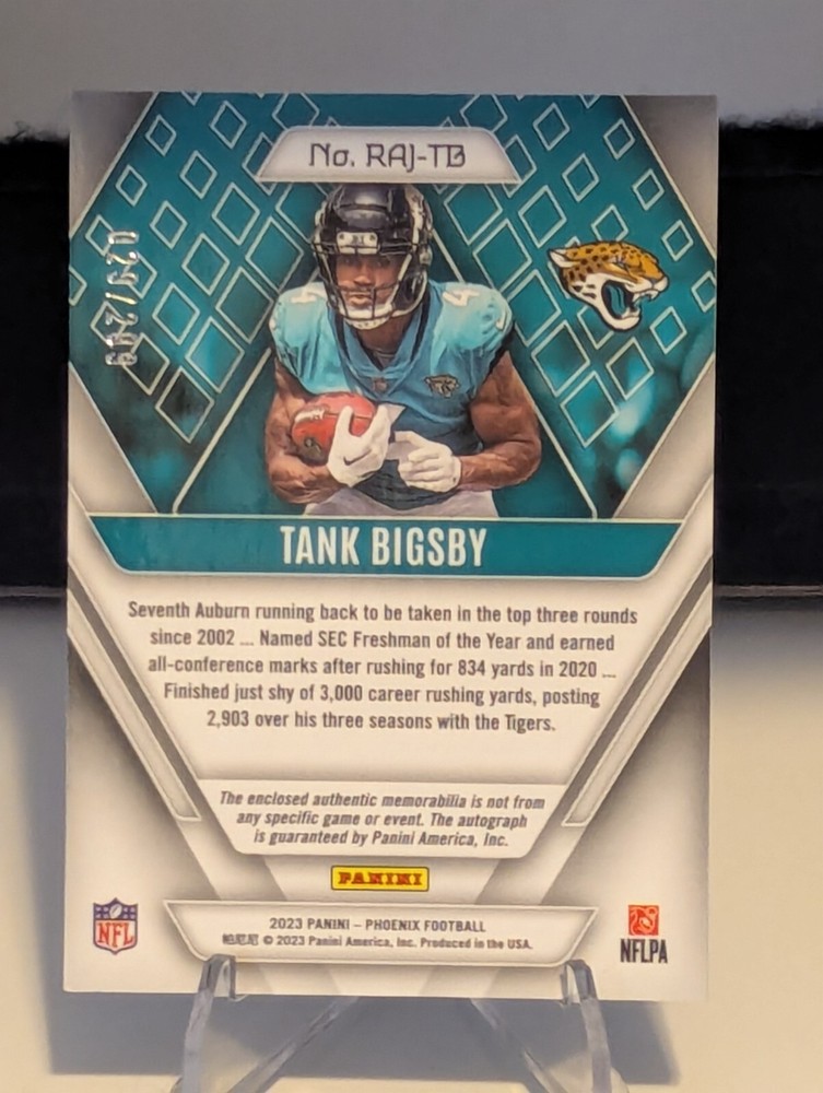 Elevate your collection with the Tank Bigsby RPA from the 2023 Panini Phoenix set, a true gem for football aficionados. This card boasts a jersey match patch, seamlessly integrating a piece of Tank Bigsby's game-worn jersey, with an authentic autograph. Limited to just 299 pieces, this card is numbered 29, making it a rare and valuable addition to any enthusiast's compilation.Crafted by Panini, a trusted name in sports trading cards, the parallel/variety patch card highlights the athlete's impressive presence on the field. Assembled with care in Jersey, this collectible captures the spirit of the sport and the prowess of the player, ensuring it stands out as a centerpiece of your collection or as a standout piece when displayed separately.