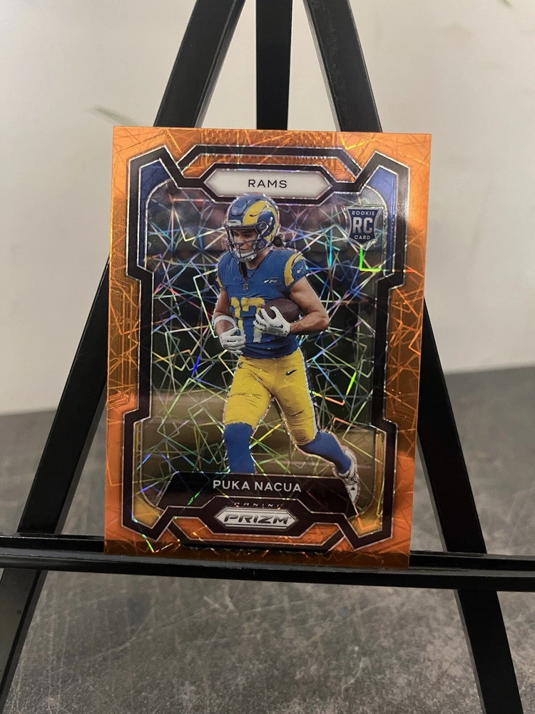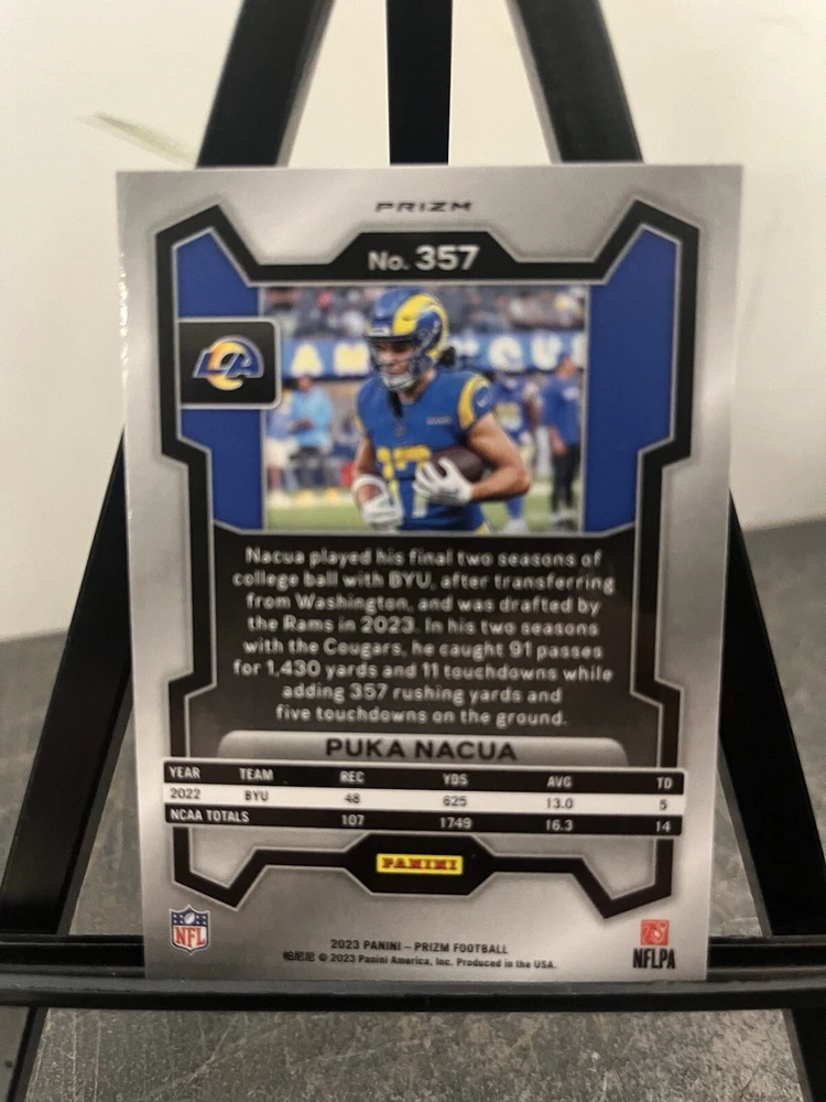 This 2023 Panini Prizm Rookies Lazer Prizm #357 Puka Nacua (RC) is a must-have for any sports trading card enthusiast. With its stunning design and high-quality printing, it's sure to be a standout addition to your collection. The card features Puka Nacua, a rising star in the sports world, and is perfect for fans of the team or the player. This card is ideal for collectors who are looking for a unique and high-quality addition to their collection. It's perfect for those who appreciate the finer details of sports trading cards and want to add something special to their collection. So why wait? Add this 2023 Panini Prizm Rookies Lazer Prizm #357 Puka Nacua (RC) to your collection today!