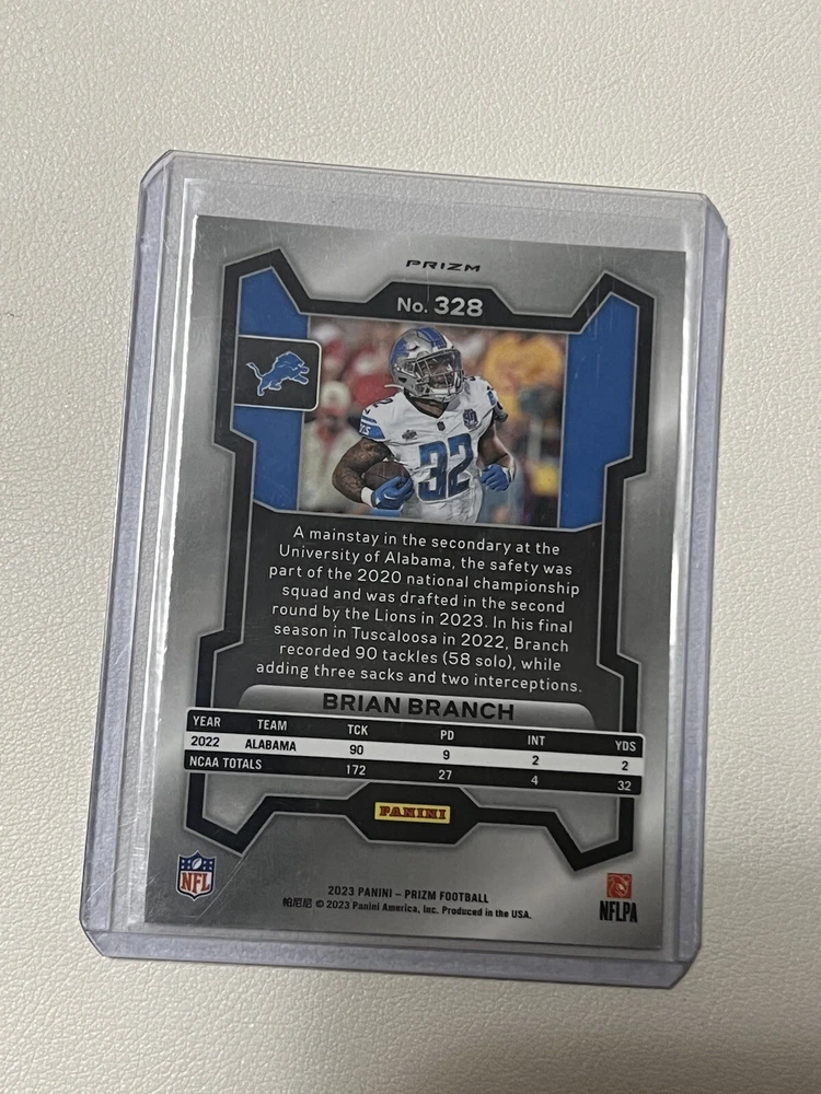 Year Manufactured:2023Card Size:StandardSet:2023 Panini PrizmCard Number:328Type:Sports Trading CardManufacturer:PaniniCard Thickness:35 Pt.Original/Licensed Reprint:OriginalFeatures:Parallel/Variety, Base Set, RookieLeague:National Football League (NFL)Season:2023Player/Athlete:Brian BranchCountry/Region of Manufacture:United StatesSport:FootballMaterial:Card StockLanguage:EnglishCard Name:PrizmParallel/Variety:Silver PrizmVintage:No
