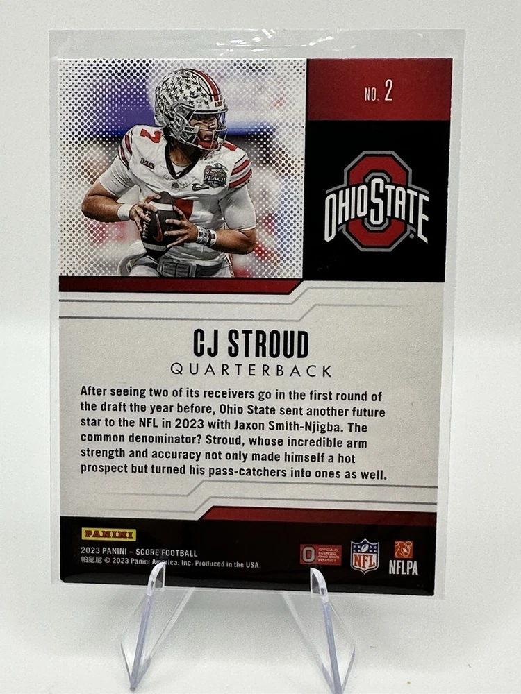 This 2023 Panini Score card features C.J. Stroud, a promising rookie athlete from the Ohio State Buckeyes football team. The card is part of the National Collegiate Athletic Association (NCAA) league and has the potential to be a valuable addition to any sports trading card collection. The card is manufactured by Panini and has the card number #2. It is a single trading card and is not graded. The 2023 Panini Set is highly sought after by collectors and this card is a must-have for fans of C.J. Stroud and the Houston Texans.