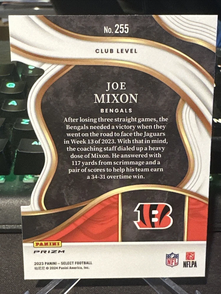 This 2023 Panini Select Club Black Green Die Cut Joe Mixon #255 card is a must-have for any Cincinnati Bengals fan or collector. Featuring one of the league's top running backs, this card is sure to be a valuable addition to your collection. The card is part of the 2023 Panini Select set and features a black and green prizm die-cut parallel/variety. It is also a part of the base set and has been manufactured by Panini. The card is ungraded, but its quality is near mint or better. This trading card is perfect for any football enthusiast and is a great investment for the future.