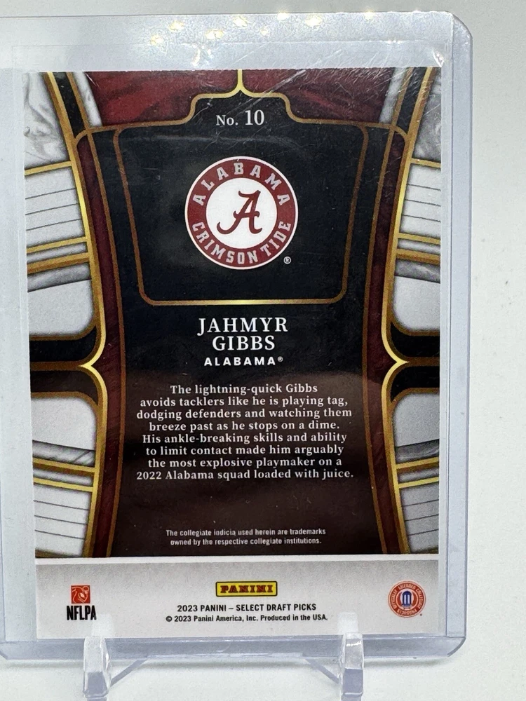 This 2023 Panini Select Draft Picks trading card features Jahmyr Gibbs, a rookie player from the Detroit Lions team in the National Football League (NFL). The card is part of the base set and has a parallel/variety design, making it a great addition to any sports trading card collection. The card is numbered #10 and is from the 2023 season. It is a must-have for any football fan or collector. Get your hands on this amazing card from Panini, a trusted manufacturer in the sports trading card industry. Add it to your collection today!