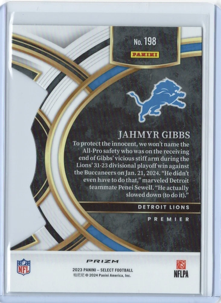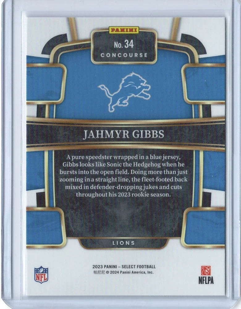 Language:EnglishCard Size:StandardType:Sports Trading CardNumber of Cards:2Manufacturer:PaniniAutographed:NoSport:FootballPlayer/Athlete:Jahmyr GibbsFeatures:Base Set, RookieYear Manufactured:2023League:National Football League (NFL)Set:2023 Panini SelectTeam:Detroit LionsAutograph Format:CutOriginal/Licensed Reprint:OriginalSeason:2023Country/Region of Manufacture:United States