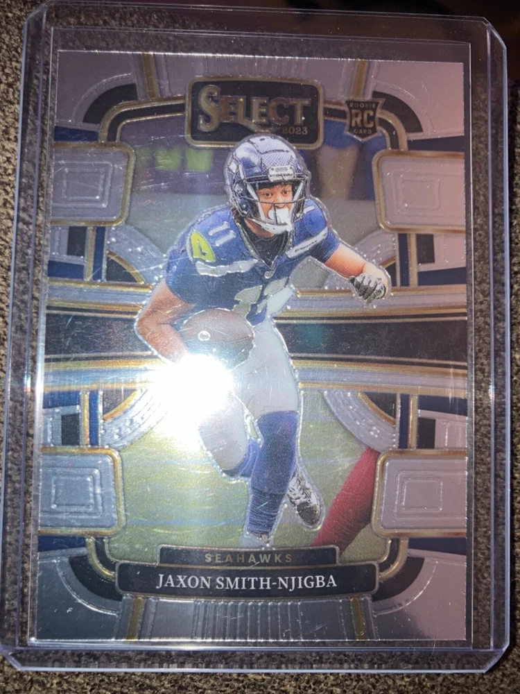 This is a 2023 Panini Select Jaxson Smith Njigba Concourse Silver (RC) #87 trading card. It features the rookie card of Jaxon Smith-Njigba, a player for the Seattle Seahawks in the National Football League (NFL). The card is part of the 2023 Panini Select set and is a Silver parallel/variety. It is a standard size sports trading card manufactured by Panini in the year 2023. The card is not autographed and its features include being a rookie card and part of the Concourse Silver series.