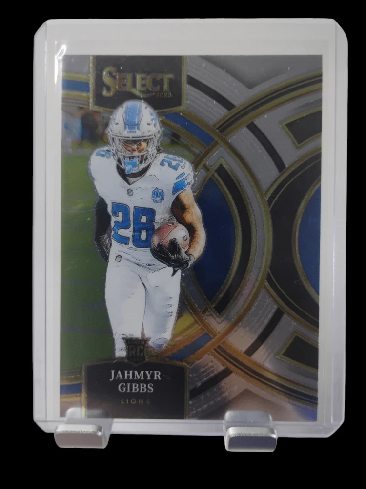 This 2023 Panini Select Premier Level sports trading card features Jahmyr Gibbs of the Detroit Lions. The card number is 198 and it is a base set rookie card. The card is in excellent shape, near mint or better, and has been well-preserved. It is a great addition to any collection for fans of the National Football League (NFL) and football in general. The card is ungraded and has not been autographed. The set is part of the Panini Select series and was manufactured in 2023. Additional description is available in the Premier Level - Jahmyr Gibbs category.
