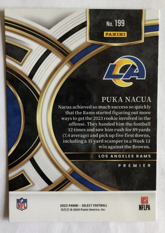 Features: Rookie Game: Unspecified Parallel/Variety: Premier Year Manufactured: 2023 Franchise: Football Set: 2023 Panini Select Manufacturer: Panini Sport: Football Card Name: 2023 Panini NFL Select Premier Puka Nacua Rookie Los Angeles Rams Vintage: No Autographed: No Character: Puka Nacua Type: Sports Trading Card Season: 2023 Card Size: 3½" x 2½" Team: Los Angeles Rams Original/Licensed Reprint: Original Player/Athlete: Puka Nacua League: National Football League (NFL) Card Number: 199