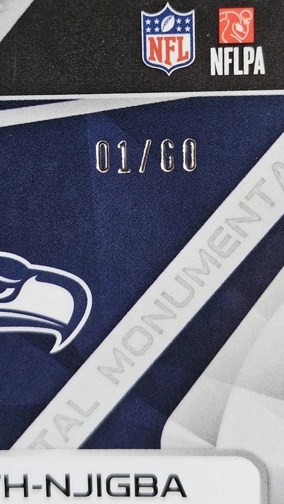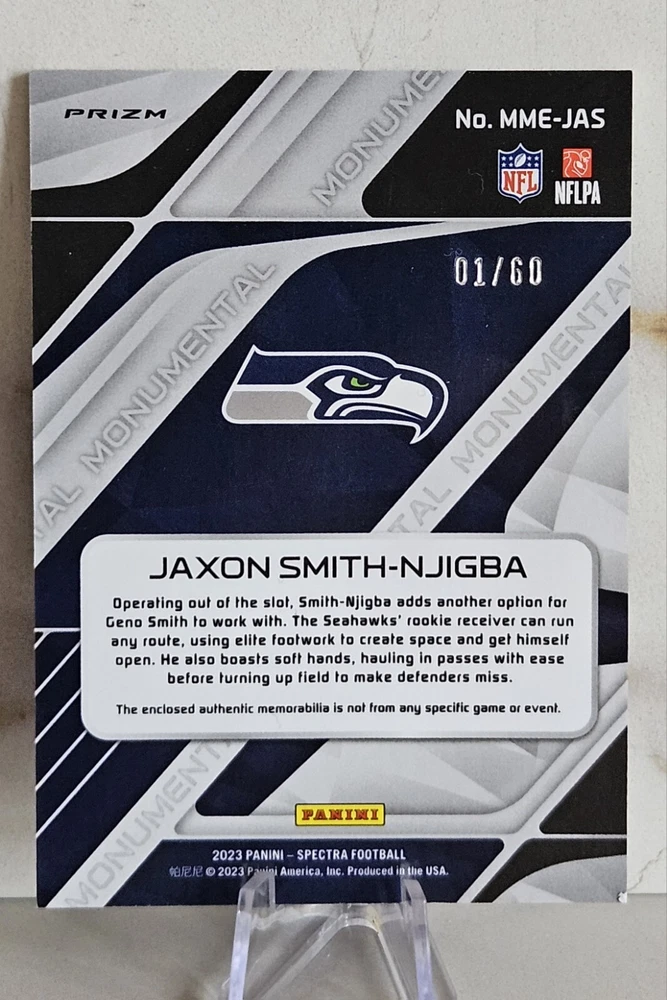This 2023 Panini Spectra trading card features Jaxon Smith-Njigba of the Seattle Seahawks. The card is a rookie card and 1st one of the press with a print run of only 60. It is a Monumental Memorabilia Prizm card, making it a unique addition to any collection. The card is ungraded and in excellent shape, with no noticeable flaws. It is from the National Football League (NFL) and is a must-have for any serious collector. Don't miss out on the opportunity to own this rare and highly sought-after card.