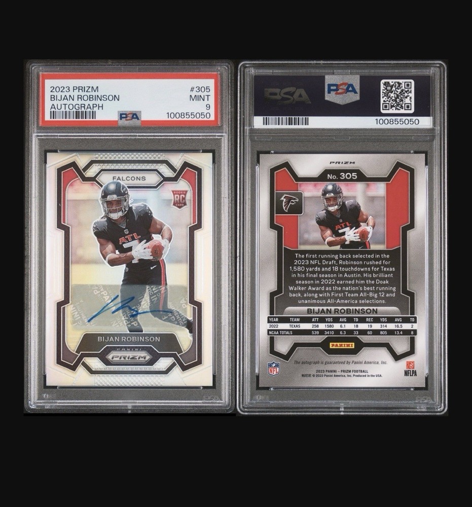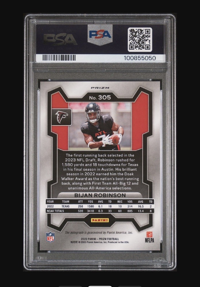 2023 Panini Prizm Bijan Robinson Silver Rookie Auto #305 PSA 9 MINT Premium autograph from Bijan Robinson's flagship 2023 Prizm Rookie Autographs set—Silver parallel #305 in PSA 9 Mint condition (cert #10085590). Falcons star RB exploded in 2025 with NFC Offensive Player of the Week honors and OPOY buzz; low-pop slab with sharp centering and refractor shine. Key Details - Set: 2023 Panini Prizm Football Rookie Autographs - Silver Prizm - Card #: 305 (serial-numbered parallel) - Grade: PSA 9 MINT (Gem slab, low pop relative to production) - Auto: Crisp autograph, authenticated by Panini Authentic - Player: Bijan Robinson - Atlanta Falcons RB, elite dual-threat upside Recent Market PSA 9 guides at ~$165; holds strong value post-Bijan's breakout year with no weak comps in last 30 days. Perfect for Falcons/PC investors—raw Silvers trade $80-120, graded autos premium. Top-loaded ships fast. No returns—scan cert verifies. #BijanRobinson #PrizmSilver #RookieAuto #PSAMint #FalconsRC $165 BIN firm.