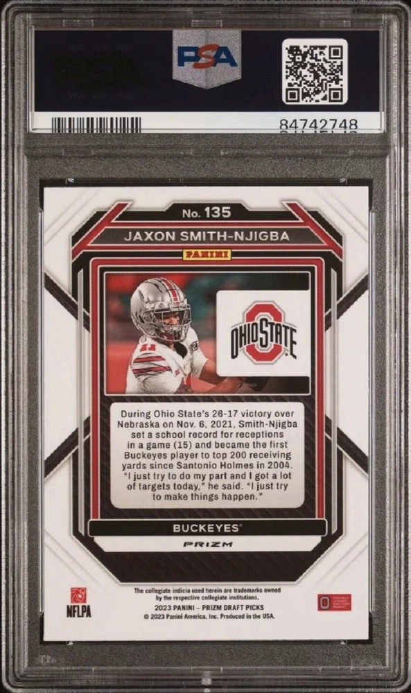 This 2023 Panini Prizm trading card features Jaxon Smith-Njigba, a rookie player from the NFL’s OSU team. The card is a Snake Skin parallel/variety, with a card number of 135. It is a gem mint PSA 10, making it a valuable addition to any sports trading card collection. The card is from the 2023 season and is an excellent find for fans of football.
