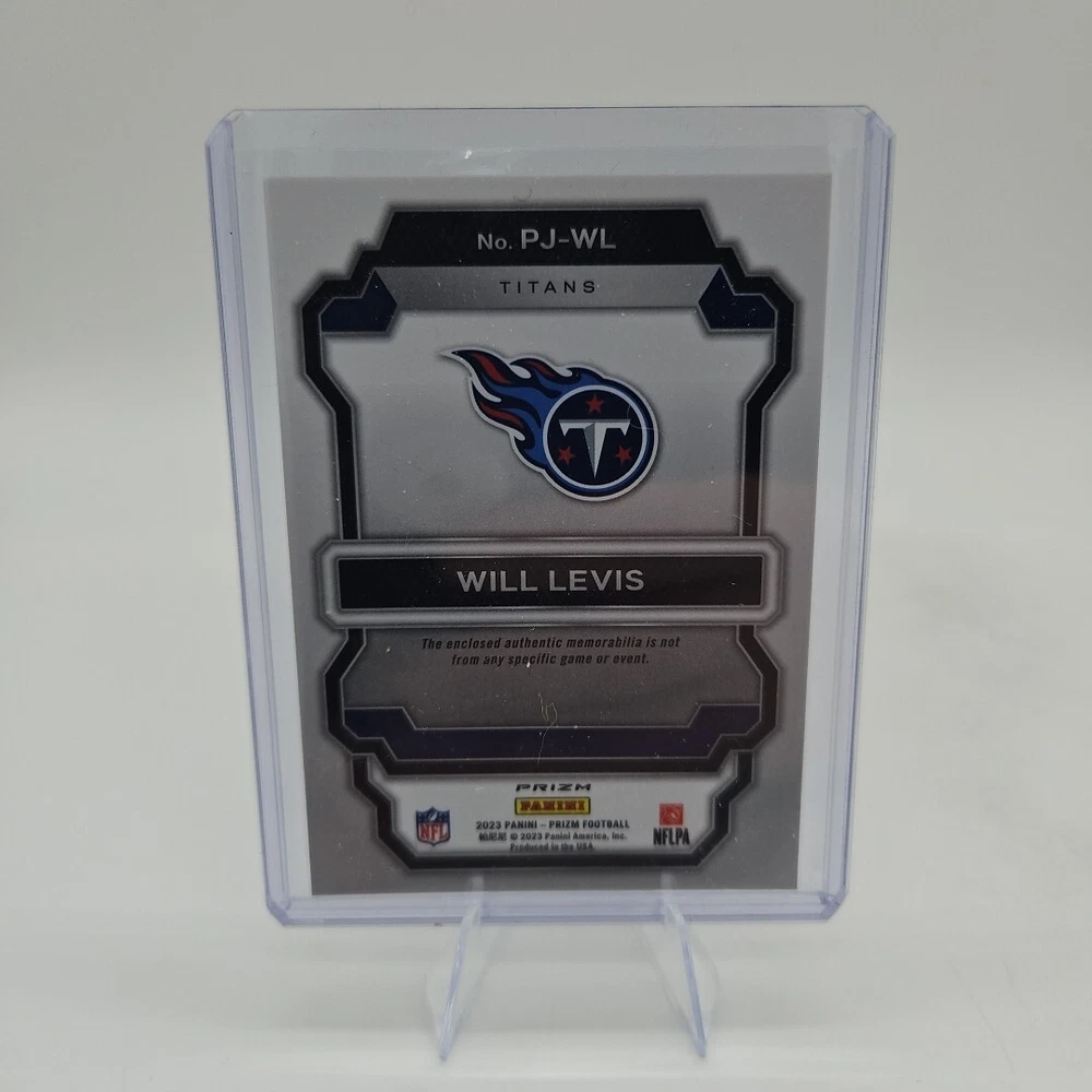 The 2023 Prizm #PJ-WL Will Levis Premier Jersey Pink Holographic trading card features a patch from Will Levis' jersey, representing his time with the Tennessee Titans in the 2023 season. Manufactured by Panini, this sports trading card is a valuable addition for football fans and collectors. The pink holographic design adds a unique and eye-catching element to the card, making it a sought-after item in the Sports Trading Cards category.