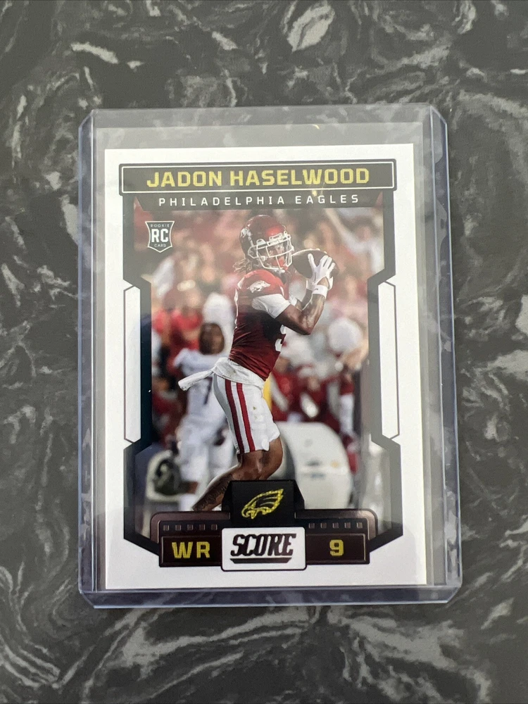 This 2023 Score card features Jadon Haselwood of the Philadelphia Eagles. The card is from the Rookies Scorecard set and has a card number of 366. It is a sports trading card with a Scorecard parallel/variety and is manufactured by Panini. The card is near mint or better and is a great addition to any collection. The card is specifically designed for fans of the National Football League (NFL) and collectors of sports trading cards. It includes features such as the rookie status of the player and the season in which it is being played. This card is a must-have for any fan or collector looking to add to their collection.