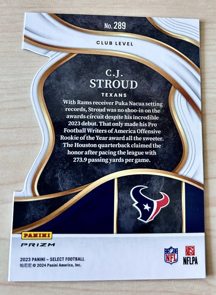 This 2023 Panini Select sports trading card features C.J. Stroud rookie card for the Houston Texans and Ohio State Buckeyes. The card is a die-cut parallel variety with a card number of 289. It is a club level green yellow prizm card that is near mint or better in condition, and it is ungraded. The card is not autographed and is a great addition to any football fan's collection.