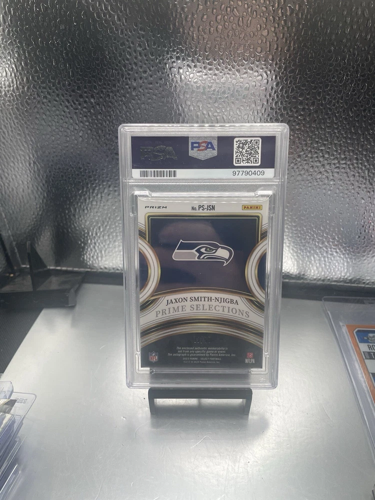 This 2023 Select Prime Selections Signature Jaxon Smith-Njigba trading card is a must-have for any serious collector. Featuring a stunning autograph and a limited print run of only 99, this card is sure to be a valuable addition to your collection. The card is from the National Football League (NFL) and depicts Smith-Njigba in his Seattle Seahawks uniform. The card is a 4-color Prime parallel/variety and has been graded by PSA with a score of 9. This card is part of the 2023 Select set and is perfect for any football or trading card fan. Don't miss out on the opportunity to own this rare and highly sought-after card.