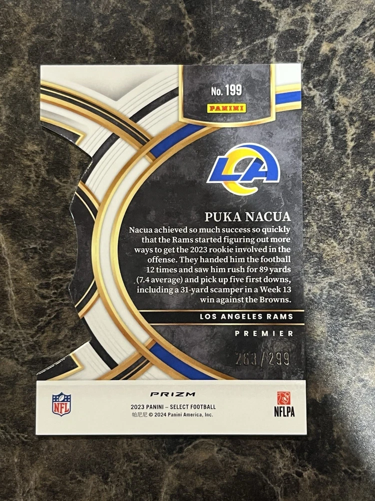 Parallel/Variety:BronzeAutographed:NoTeam:Los Angeles RamsCard Number:199Card Name:Bronze Die CutYear Manufactured:2024Player/Athlete:Puka NacuaSeason:2023-24Type:Sports Trading CardLeague:National Football League (NFL)Sport:FootballFeatures:Chase, Parallel/Variety, Rookie, Short Print, Die-Cut, Red & Blue PrizmCard Size:StandardPrint Run:SPCountry/Region of Manufacture:United StatesManufacturer:PaniniSet:2023 Panini Select