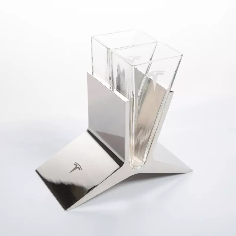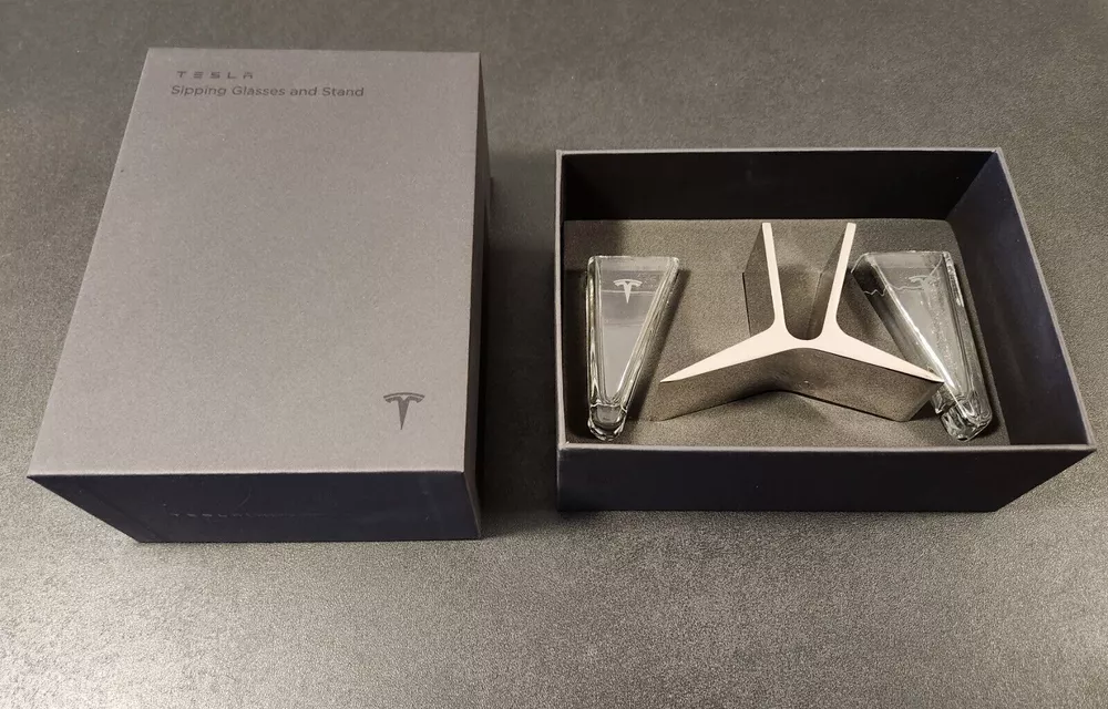 Tesla tequila Sipping Glasses Savor your favorite liquor with a limited edition set of Tesla Sipping Glasses. Inspired by Tesla Tequila’s unique silhouette, each glass is designed with angular contours and an engraved Tesla logo. Display your glassware proudly in a matching metal stand. 1.5oz per glass, 3.5" tall