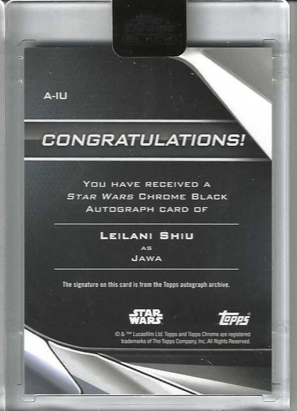 The 2023 Topps Chrome Black JAWA Autograph Refractor trading card features an autograph from Leilani Shiu, who portrayed a Jawa character in Star Wars: Episode IV – A New Hope. This collectible card is part of the Star Wars and Mandalorian franchises and is manufactured by Topps. The card is a non-sport trading card with a refractor parallel/variety, making it a rare and sought-after item for fans of the action genre.