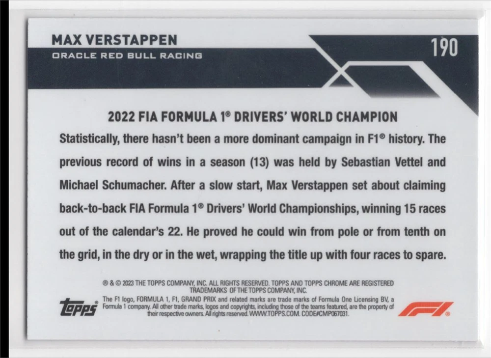 About Me Other Listings Feedback Add to Favorites Contact Me Striking Cards 901 2023 Topps Chrome Formula 1 Award Winners Max Verstappen Oracle Red Bull Racing No stock photo / These are real scans or pictures Details Description: Max Verstappen Category: Racing Year: 2023 Product: Topps Chrome Formula 1 Award Winners Team: Oracle Red Bull Racing Card Number: 190 Dimensions: 3½" x 2½" SKU: RA B0001 R01 B (132) Listing By Kronocard trading cards software v2.7.0.1
