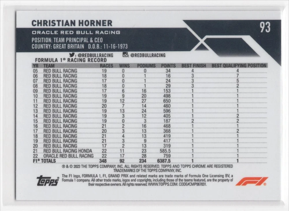About Me Other Listings Feedback Add to Favorites Contact Me Striking Cards 901 2023 Topps Chrome Formula 1 Christian Horner Oracle Red Bull Racing #93 No stock photo / These are real scans or pictures Details Description: Christian Horner Category: Racing Year: 2023 Product: Topps Chrome Formula 1 Team: Oracle Red Bull Racing Card Number: 93 Dimensions: 3½" x 2½" SKU: RA B0001 R01 B (249) Listing By Kronocard trading cards software v2.7.0.1