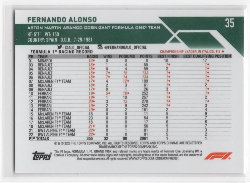 About Me Other Listings Feedback Add to Favorites Contact Me Striking Cards 901 2023 Topps Chrome Formula 1 Fernando Alonso Aston Martin Aramco Cognizant F1 No stock photo / These are real scans or pictures Details Description: Fernando Alonso Category: Racing Year: 2023 Product: Topps Chrome Formula 1 Team: Aston Martin Aramco Cognizant F1 Team Card Number: 35 Dimensions: 3½" x 2½" SKU: RA B0001 R01 B (217) Listing By Kronocard trading cards software v2.7.0.1