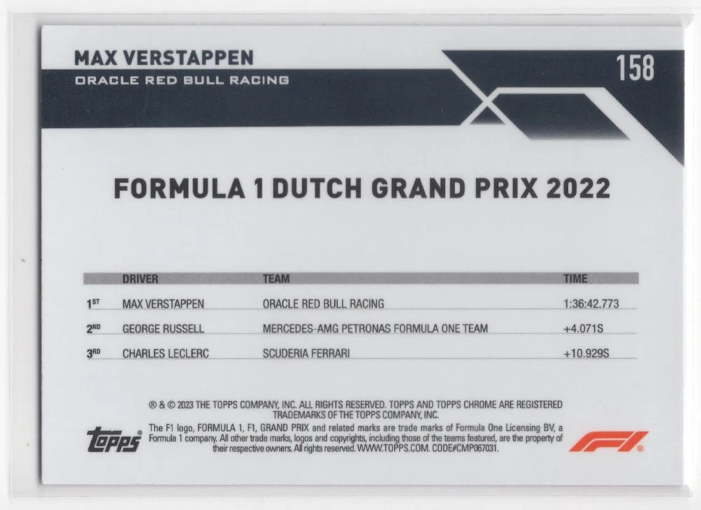 About Me Other Listings Feedback Add to Favorites Contact Me Striking Cards 901 2023 Topps Chrome Formula 1 Max Verstappen Oracle Red Bull Racing #158 No stock photo / These are real scans or pictures Details Description: Max Verstappen Category: Racing Year: 2023 Product: Topps Chrome Formula 1 Team: Oracle Red Bull Racing Card Number: 158 Dimensions: 3½" x 2½" SKU: RA B0001 R01 B (225) Listing By Kronocard trading cards software v2.7.0.1