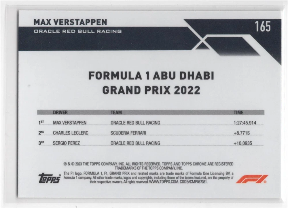 About Me Other Listings Feedback Add to Favorites Contact Me Striking Cards 901 2023 Topps Chrome Formula 1 Max Verstappen Oracle Red Bull Racing #165 No stock photo / These are real scans or pictures Details Description: Max Verstappen Category: Racing Year: 2023 Product: Topps Chrome Formula 1 Team: Oracle Red Bull Racing Card Number: 165 Dimensions: 3¾" x 2½" SKU: RA B0001 R01 B (233) Listing By Kronocard trading cards software v2.7.0.1