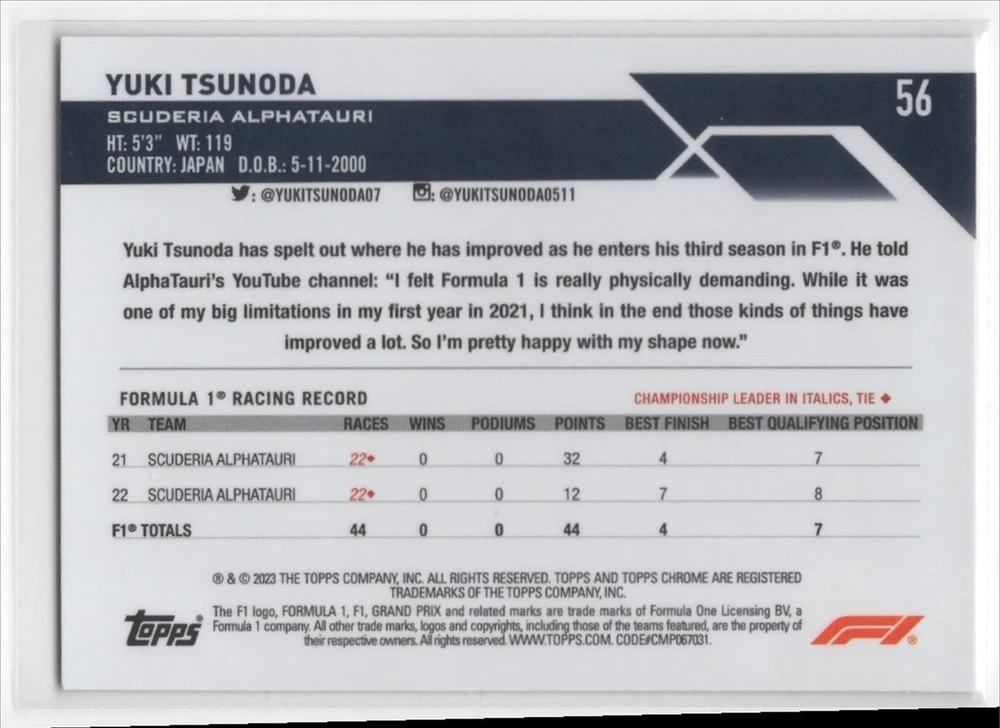 2023 Topps Chrome Formula 1 Yuki Tsunoda Scuderia AlphaTauri #56