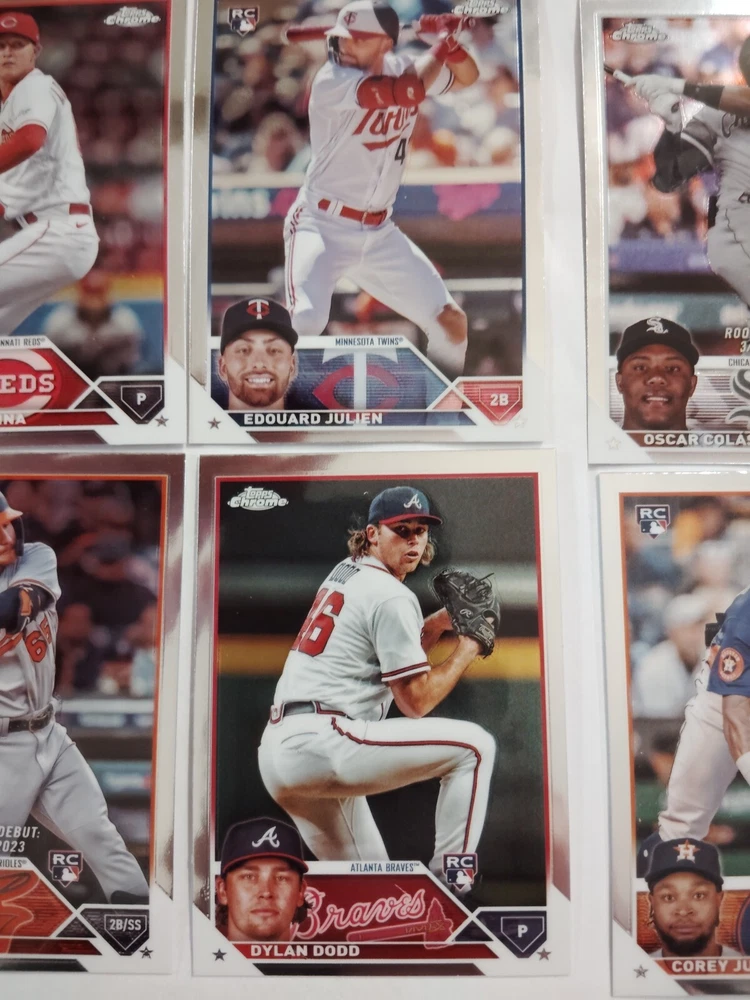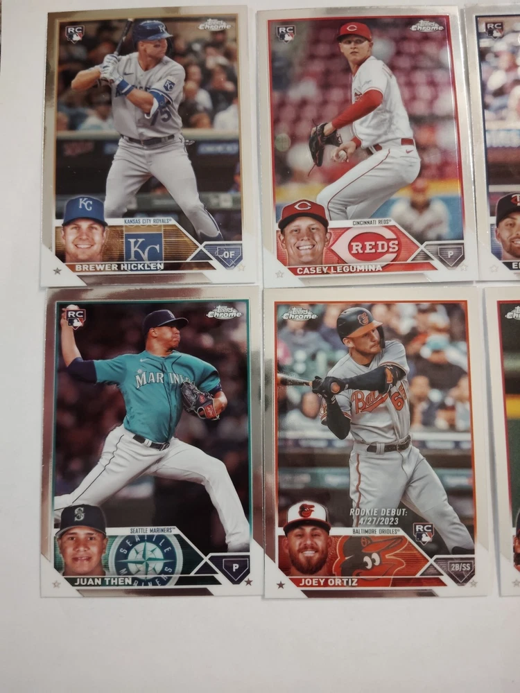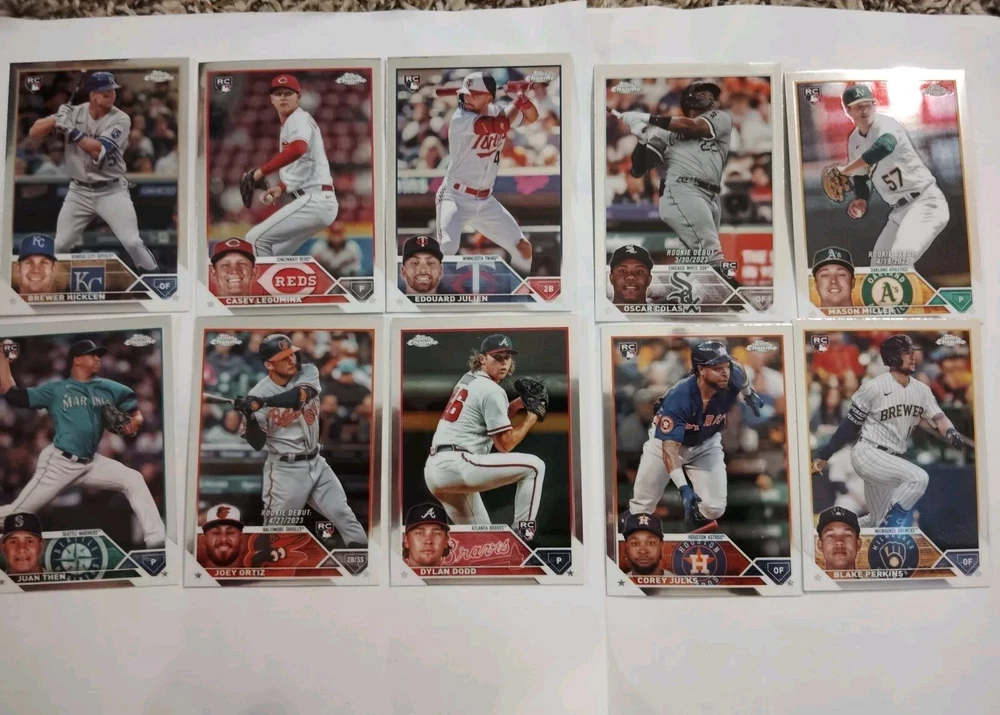 This 10-card lot from the 2023 Topps Chrome update set features rookie players from various Major League Baseball teams, including the Oakland Athletics, Chicago White Sox, and Seattle Mariners. Each card is made of sturdy card stock and showcases the player's stats and picture. The lot includes players such as Dylan Dood, Mason Miller, Corey Julks, Blake Perkins, Joey Ortiz, Casey Y Legumina, Juan Then, Oscar Colas, Brewer Hicklen, and Edouard Julien. These cards are original and not autographed. Perfect for any baseball fan or collector, this lot is a great addition to any sports trading card collection.
