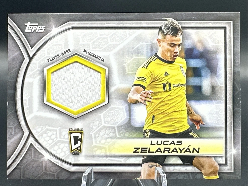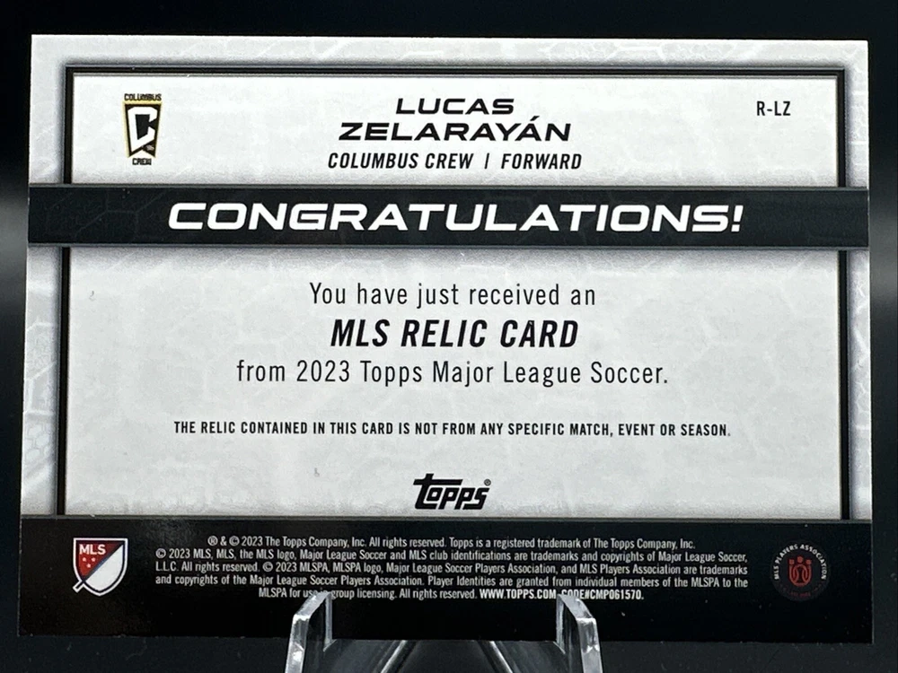 Own a piece of soccer history with this 2023 Topps MLS Player Worn Relic trading card featuring Lucas Zelarayan of the Columbus Crew SC. This original card made of high-quality card stock showcases a relic worn by the player during a match, making it a must-have for any Major League Soccer fan or collector. The card is part of the 2023 Topps MLS set and is a standard size trading card with English language text. It is not autographed but features memorabilia from the player. The card number is R-LZ and it is a parallel/variety relic card. Don't miss your chance to add this unique and valuable card to your collection.