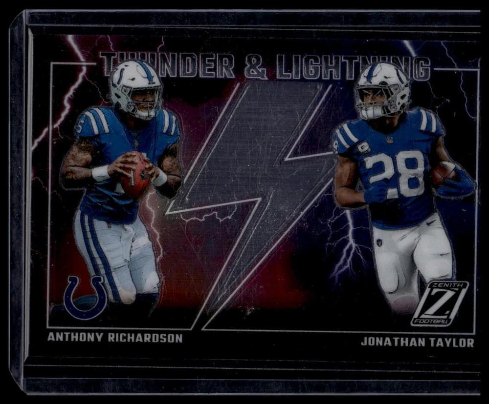 This is a nice example of a 2023 Zenith #11 Anthony Richardson / Jonathan Taylor Thunder and Lightning Other important information about this card: Insert,RC,Chase,Checklist,Parallel,SP In 2023 Anthony Richardson / Jonathan Taylor played for the Indianapolis Colts. Please check out our other listings for more great cards.