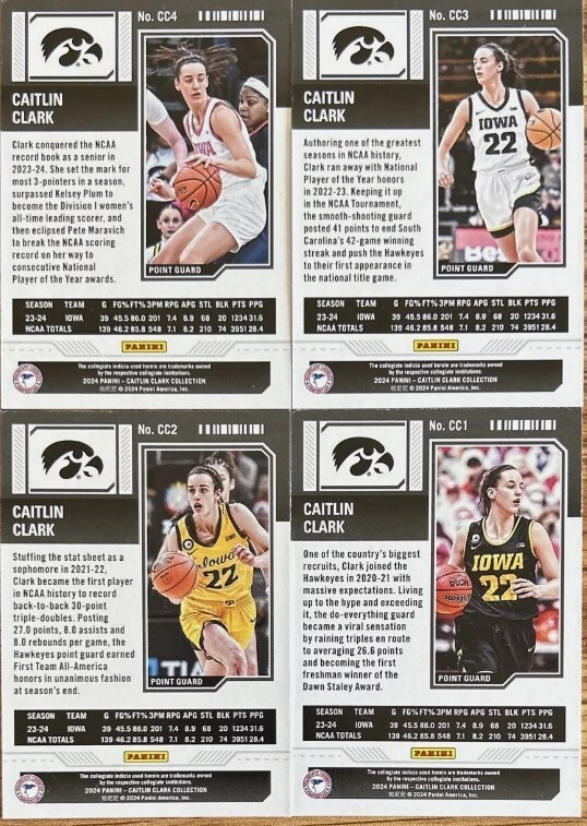 Get your hands on the 2023-2024 Panini Caitlin Clark Collection Contenders Season Ticket 4 Card Set. This set includes four sports trading cards featuring the Indiana Fever and Iowa Hawkeyes player, Caitlin Clark. The cards are from the 2024 Panini set and are perfect for any basketball fan or collector. The cards are not autographed or signed by the player, but they do come with a set of parallel/variety options. The set is a great addition to any sports trading card collection and is perfect for displaying or adding to your collection. Don't miss out on the chance to own this unique set and show off your love for the sport!