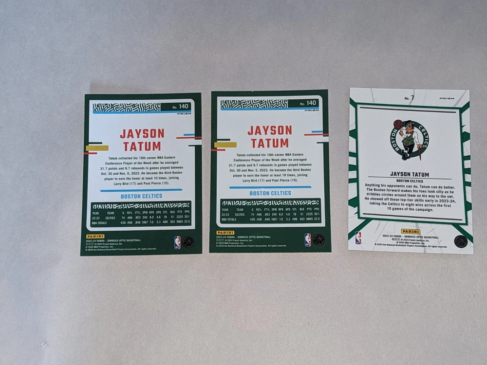 This lot of 3 sports trading cards featuring Jason Tatum from the 2023-24 season is a must-have for any collector. The cards are from the popular Donruss Optic Prizm series and are sure to impress. Each card showcases Tatum in action and is a great addition to any collection. Whether you're a fan of the Charlotte Hornets or just a lover of sports trading cards, this lot is perfect for you. These cards are highly sought after and will be a valuable addition to your collection. Don't miss out on the chance to own this amazing lot of 3 sports trading cards.