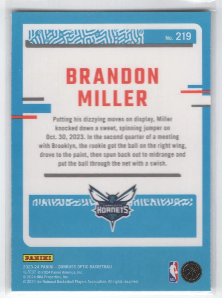 About Me Other Listings Feedback Add to Favorites Contact Me eBay Store Striking Cards 901 2023-24 Donruss Optic Rated Rookie Brandon Miller Rookie Charlotte Hornets #219 No stock photo / These are real scans or pictures Details Description: Brandon Miller Category: Basketball Year: 2023 Product: Donruss Optic Rated Rookie Team: Charlotte Hornets Card Number: 219 Rookie: Yes Dimensions: 3½" x 2½" SKU: BK B0001 R01 L (180) Listing By Kronocard trading cards software v2.7.0.1