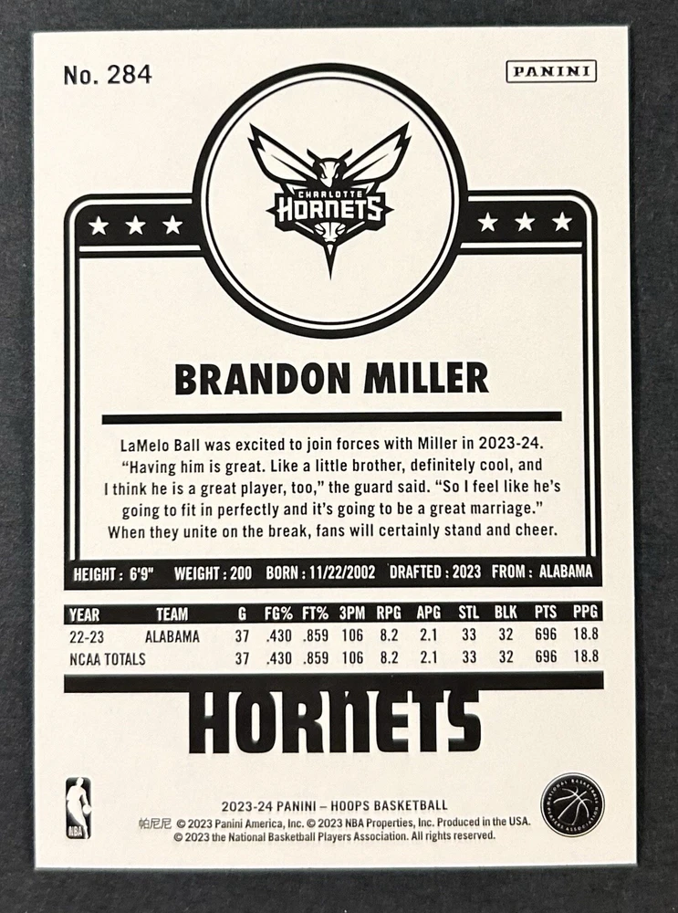 Elevate your basketball card collection with the 2023-24 Panini NBA Hoops Brandon Miller #284 Rookie Card. As a standout addition, this card features the promising talent of Brandon Miller, capturing the essence of his rookie season with the Charlotte Hornets. A must-have for fans and collectors alike, this card is part of the esteemed Base Set produced by Panini, ensuring a high-quality collectible for enthusiasts of the sport. The card details Miller's athletic prowess on the court during the NBA's exciting 2023-24 season. Numbered #284, it represents a tangible piece of basketball history. Whether you're a fan of the sport, a follower of Miller's rising career, or a collector of NBA memorabilia, this card is a noteworthy acquisition for any collection.