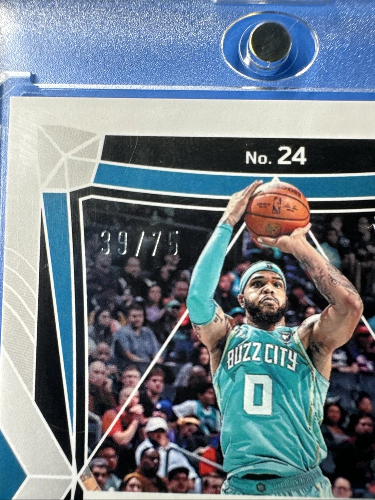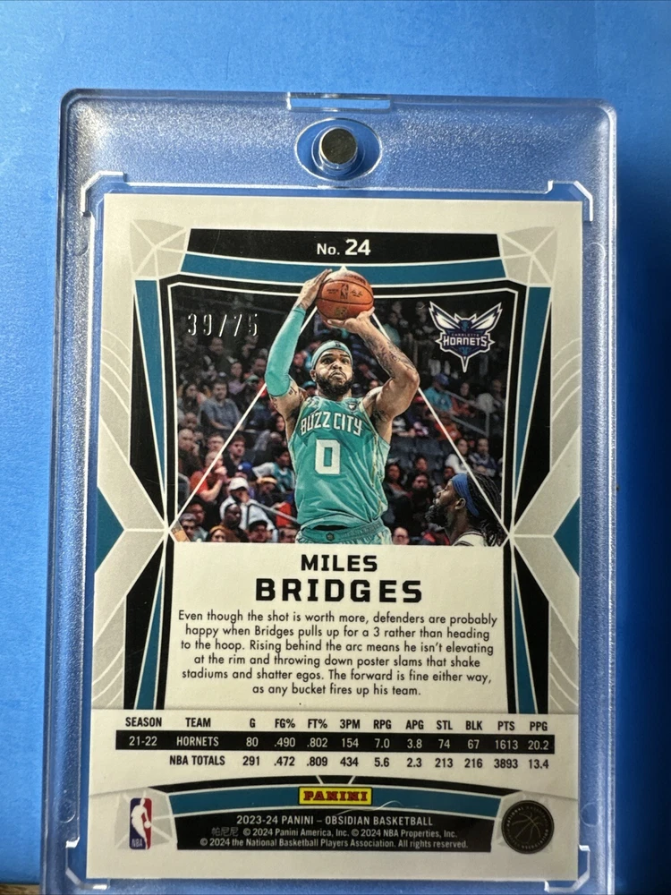 This 2023-24 Panini Obsidian Miles Bridges Reggae Flood /75 card is a must-have for any Charlotte Hornets fan or collector. This sports trading card features the NBA player in purple flood design, with a print run of only 49. The card is serial numbered and part of the 2023-24 Panini set. As a rare parallel/variety card, this item is sure to be a prized possession for years to come. Whether you're a fan of Miles Bridges or simply collecting NBA trading cards, this card is a great addition to any collection. Don't miss your chance to own this unique piece of sports memorabilia.