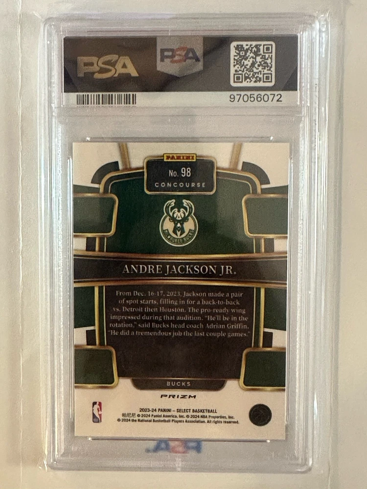 This rare 2023-24 Panini Select sports trading card features Andre Jackson Jr. of the Milwaukee Bucks. The card is a parallel variety Elephant Prizm rookie card, with a hologram and short print. It also includes exclusive features, making it a must-have for any basketball fan or collector. The card number is 98 and it is from the 2023-24 season. Don't miss out on the opportunity to own this highly sought-after card.
